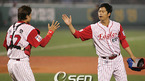 17일 2006 프로야구 플레이오프 한화 이글스와 현대 유니콘스의 4차전 경기는 1회말 터진 김태균의 3점 홈런과 송진우 문동환 구대성의 완벽계투로 한화가 4-0 완봉승을 거두며 한국시리즈에 진출했다. 구대성과 심광호가 하이파이브를 나누고 있다./대전=손용호 기자spjj@osen.co.kr [Copyright ⓒ 한국 최고의 스포츠 엔터테인먼트...