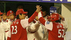 23일 대구 야구장에서 열린 2006 프로야구 한국시리즈 2차전 삼성 라이온즈와 한화 이글스의 경기 4회초 2사 1,2루서 한상훈의 우측 2루타 때 2루주자 김태균이 홈인, 2-1로 뒤집은 뒤 동료들로부터 축하를 받고 있다./대구=김영민 기자ajyoung@osen.co.kr [Copyright ⓒ 한국 최고의 스포츠 엔터테인먼트 전문 미디어...