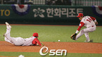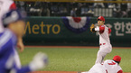 한국시리즈 우승의 중요한 분수령이 될 2006 한국시리즈 3차전 한화 이글스와 삼성 라이온즈의 경기가 25일 대전야구장에서 벌어졌다. 7회초 1사 후 3유간 깊숙한 박진만의 타구를 한화 3루수 이범호가 다이빙 캐치에 실패한 뒤 유격수 김민재가 잡아 1루 송구를 노렸으나 타이밍이 늦어 포기하고 있다./대전=손용호 기자spjj@osen.co.kr...