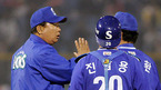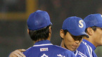 26일 대전야구장에서 벌어진 2006 프로야구 한국시리즈 4차전 경기서 삼성이 이틀 연속 연장 접전을 벌인 끝에 김재걸의 적시타와 배영수 오승환으로 이어지는 계투로 4-2로 승리했다. 김재걸이 어렵사리 세이브에 성공한 오승환을 격려해 주고 있다./대전=김영민 기자ajyoung@osen.co.kr [Copyright ⓒ 한국 최고의 스포츠 엔터테인먼트...