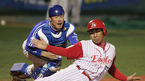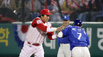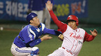 2006 프로야구의 정상을 가리는 한화 이글스와 삼성 라이온스의 한국시리즈 4차전 경기가 26일 대전 야구장에서 열렸다. 한화의 2회말 1사 1,2루서 백재호의 2루 땅볼 때 1루주자 이도형이 런다운에 걸린 틈을 이용, 2루주자 이범호가 홈을 파고들다 태그아웃되고 있다./대전=손용호 기자spjj@osen.co.kr [Copyright ⓒ 한국 최고의...