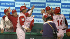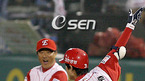 26일 대전 야구장에서 열린 2006 프로야구 한국시리즈 4차전 삼성 라이온즈와 한화 이글스의 경기 한화의 3회말 2사 2루서 클리어의 좌중간 2루타 때 홈을 밟아 1-1 동점을 만든 김민재가 동료들의 환영을 받고 있다./대전=김영민 기자ajyoung@osen.co.kr [Copyright ⓒ 한국 최고의 스포츠 엔터테인먼트 전문 미디어...