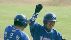 2006 프로야구 한국시리즈 삼성 라이온즈와 한화 이글스의 6차전 경기가 29일 잠실야구장에서 벌어졌다. 1회에 이어 2회에도 2루타를 치고 나간 박한이가 조동찬의 적시타 때 홈인하며 양준혁의 환영을 받고 있다./잠실=손용호 기자spjj@osen.co.kr [Copyright ⓒ 한국 최고의 스포츠 엔터테인먼트 전문 미디어...
