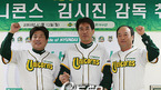 현대 유니콘스 제2대 선장으로 선임된 김시진(48) 감독이 13일 수원구장 회의실에서 취임식을 가졌다.김시진 감독은“정직한 땀으로 ‘찰거머리 야구’를 보여주겠다”며 자신의 감독으로서 야구관을 밝혔다. 김시진 감독이 이광근 수석코치(왼쪽), 금광옥 배터리 코치와 손을 맞잡고 파이팅을 외치고 있다./수원=손용호 기자spjj@osen.co.kr...