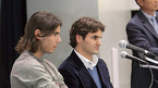21일 잠실체육관에서 열리는 '현대카드 슈퍼매치III'경기를 가지기 위해 방한한 남자 테니스 세계랭킹 1, 2위 로저 페더러와 라파엘 나달이 20일 여의도 현대카드 본사에서 환영식 및 입국 기자회견을 가졌다. 나달이(왼쪽) 통역의 미국식 영어 발음이 알아듣기 어려운 듯 페더러를 통해 다시 듣고 있다./손용호...
