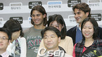 21일 잠실체육관에서 열리는 '현대카드 슈퍼매치III'경기를 가지기 위해 방한한 남자 테니스 세계랭킹 1, 2위 로저 페더러와 라파엘 나달이 20일 여의도 현대카드 본사에서 환영식 및 입국 기자회견을 가졌다. 나달이 자신의 사인이 적힌 라켓을 기념으로 받은 사람들과 기념사진을 찍을때 한 여성이 고개를 못 들자 웃고 있다./손용호...
