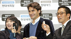 21일 잠실체육관에서 열리는 '현대카드 슈퍼매치3' 경기를 가지기 위해 방한한 남자 테니스 세계랭킹 1, 2위 로저 페더러와 라파엘 나달이 20일 여의도 현대카드 본사에서 환영식 및 입국 기자회견을 가졌다. 나달이 자신의 사인이 적힌 라켓을 선물로 받은 현대카드 여직원과 밝은 표정으로 악수를 하고 있다./손용호...