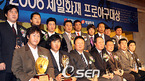 13일 일간스포츠가 주최하고 제일화재가 후원하는 '2006 제일화재 프로야구대상' 시상식이 프라자 호텔에서 열렸다. 프로감독상을 수상한 삼성 선동렬 감독에게 김재하 단장이 꽃다발을 건네고 있다./손용호 기자spjj@osen.co.kr [Copyright ⓒ 한국 최고의 스포츠 엔터테인먼트 전문 미디어...