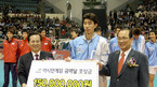 프로배구 'HILLSTATE 2006~2007 V리그' 개막식이 24일 오후 서울 잠실학생체육관에서 열렸다. 김혁규 한국배구연맹(KOVO) 총재(왼쪽)와 장영달 대한배구협회(KVA) 회장이 2006 도하 아시안게임에서 금메달을 차지한 남자대표팀을 대표한 후인정에게 1억 5000만 원의 포상금을 전달하고 있다./잠실학생체=김영민...