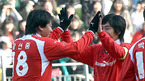 ‘홍명보 장학재단과 함께 하는 2006 PUMA 자선축구경기'가 크리스마스인 25일 수원 월드컵구장에서 열렸다. 이날 행사에는 축구 선수뿐만 아니라 유도 스타 이원희와 테니스 스타 이형택이 참가, 경기를 빛냈다. 황선홍 전 전남 코치가 선제골을 넣은 뒤 윤정환과 하이파이브를 나누고 있다./수원=손용호 기자spjj@osen.co.kr...
