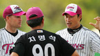 미국에서 활약하다 복귀한 LG 트윈스의 봉중근이 사이판에서 실시되고 있는 팀 전지훈련 중 차명석 투수코치가 새 용병 하리칼라와 이야기를 나누는 것을 통역해 주며 돕고 있다./LG 트윈스 제공. [Copyright ⓒ 한국 최고의 스포츠 엔터테인먼트 전문 미디어 OSEN(www.osen.co.kr) 무단전재 및 재배포 금지]