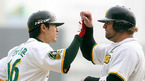 현대 유니콘스와 삼성 라이온즈의 시범경기가 27일 수원구장에서 열렸다. 현대의 6회말 2사 1,3루서 정성훈이 역전 좌월 스리런 홈런을 날리고 홈인하면서 이숭용의 축하를 받고 있다./수원=김영민 기자ajyoung@osen.co.kr [Copyright ⓒ 한국 최고의 스포츠 엔터테인먼트 전문 미디어 OSEN(www.osen.co.kr) 무단전재...