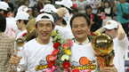 울산 모비스가 1일 울산 동천체육관서 벌어진 '2006-2007 현대모비스 프로농구' 챔피언결정전 7차전서 부산 KTF를 꺾고 정상에 올랐다. 김재훈이 동료에게 승리의 샴페인 세례를 퍼붓고 있다./울산=김영민 기자ajyoung@osen.co.kr [Copyright ⓒ 한국 최고의 스포츠 엔터테인먼트 전문 미디어...