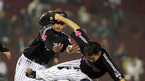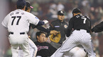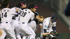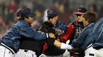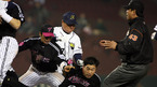 2007 프로야구 서울 라이벌 두산 베어스와 LG 트윈스의 시즌 첫 경기가 4일 잠실 구장에서 벌어졌다. 5회말 1사 1루서 LG 선발투수 봉중근의 볼이 머리 위로 날아가자 흥분한 타자 안경현이 달려가 몸싸움을 벌여 양 팀 선수단이 뒤엉킨 채 동료들을 말리고 있다./잠실=김영민 기자ajyoung@osen.co.kr <2007 삼성 PAVV...