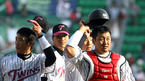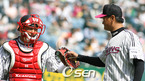 2007 프로야구 LG 트윈스와 롯데 자이언츠의 경기가 13일 잠실야구장에서 벌어졌다. 4회초 수비를 마친 LG 배터리 조인성과 박명환이 주먹을 마주치고 있다./잠실=손용호 기자spjj@osen.co.kr <2007 삼성 PAVV 프로야구> [Copyright ⓒ 한국 최고의 스포츠 엔터테인먼트 전문 미디어 OSEN(www.osen.co.kr)...