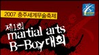 [OSEN=박선양 기자]'비보이들이 무술과 사랑에 빠진다'. 충북 충주시(시장 김호복)와 (재)중원문화관광재단(이사장 김무식)은 올해로 10주년을 맞는 2007충주세계무술축제의 일환으로 9월 29일 개최되는 퓨전 창작 비보이 배틀 <충주 마셜 아츠(Martial Arts) 비보이 그랑프리>의 참가팀을 8월 25일까지 공개 모집한다....
