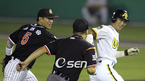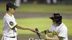 2007 삼성PAVV 프로야구 현대 유니콘스와 롯데 자이언츠의 경기가 2일 수원야구장에서 벌어졌다. 롯데의 8회초 정수근 타석 때 부러진 배트를 현대의 3루수 정성훈이 경기 도우미에게 건네주고 있다. /수원=황세준 기자 storkjoon@osen.co.kr [Copyright ⓒ 한국 최고의 스포츠 엔터테인먼트 전문 미디어...