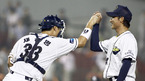 2007 삼성PAVV 프로야구 두산 베어스와 한화 이글스 경기가 2일 잠실 야구장에서 열렸다. 두산이 6-4로 승리를 거두었다. 9회말 동점 위기를 딛고 세이브에 성공한 정재훈과 포수 채상병이 하이파이브를 하고 있다./잠실=김영민 기자ajyoung@osen.co.kr <2007 삼성 PAVV 프로야구> [Copyright ⓒ 한국 최고의 스포츠...