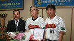 [OSEN=손찬익 기자] 롯데 자이언츠는 14일 사직구장서 강병철 감독의 개인 통산 900승 달성 기념행사를 가졌다. 이 자리서 하영철 롯데 자이언츠 대표이사는 순금 75g(20돈쭝) 상당의 행운의 열쇠와 기념패를 증정했고 선수 대표로 손민한이 축하 꽃다발을 전달했다. 강 감독은 지난 9일 사직 삼성전에서 11-4 승리를 거두며 3연패...