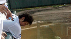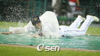 2007 프로야구 두산 베어스와 KIA 타이거즈의 경기가 15일 잠실야구장에서 벌어져 두산이 5-1로 앞서던 7회말 1사 후 비로 중단된 뒤 강우콜드게임이 됐다. 두산 선발투수 리오스는 7이닝 1실점 완투로 15승 고지에 올랐다. 두산의 최준석이 덕아웃 앞에 고인 물에 손을 담그자 손목까지 차고 있다./잠실=손용호 기자spjj@osen.co.kr...