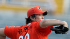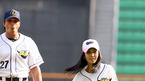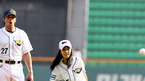 2007 프로야구 두산 베어스와 KIA 타이거즈의 경기가 15일 잠실야구장에서 벌어졌다. 경기에 앞서 여성 보컬그룹 '소녀시대'의 유리가 시구에서는 유례가 없는 언더핸드로 투구하는 모습을 두산 선발투수 리오스가 지켜보고 있다./잠실=손용호 기자spjj@osen.co.kr <2007 삼성 PAVV 프로야구> [Copyright ⓒ 한국...