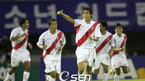 18일 수원 종합운동장서 열린 '2007 FIFA 청소년(U-17) 월드컵' 한국과 페루의 조예선 1차전 경기서 1-0으로 승리한 페루 선수들이 종료휘슬이 울리자 서로 선을 번쩍 치켜들며 기뻐하고 있다. /수원=황세준 기자 storkjoon@osen.co.kr [Copyright ⓒ 한국 최고의 스포츠 엔터테인먼트 전문 미디어...