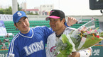 2007 삼성PAVV 프로야구 LG 트윈스와 삼성 라이온즈 경기가 18일 잠실 야구장에서 열렸다. 경기에 앞서 LG 트윈스 조인성의 1,000경기 출장 기념 시상식이 열렸다. LG 트윈스 주장 이종렬이 기념 꽃다발을 전달하고 있다./잠실=김영민 기자ajyoung@osen.co.kr <2007 삼성 PAVV 프로야구> [Copyright ⓒ 한국...
