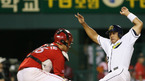 2007 삼성PAVV 프로야구 두산 베어스와 SK 와이번스의 경기가 21일 잠실 야구장에서 벌어졌다.두산의 5회말 2사 2루서 이대수의 중전 안타 때 2루 주자이 홍성흔이 홈까지 뛰었으나 SK 포수 박경완에게 태그아웃되고 있다./잠실=김영민 기자ajyoung@osen.co.kr <2007 삼성 PAVV 프로야구> [Copyright ⓒ 한국 최고의...