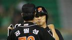 2007 삼성PAVV 프로야구 LG 트윈스와 롯데 자이언츠의 경기가 29일 잠실 야구장에서 벌어졌다.롯데의 4회초 무사 만루에서 정보명이 2타점 적시타를 치고 공필성 1루코치의 축하를 받고 있다./잠실=김영민 기자ajyoung@osen.co.kr <2007 삼성 PAVV 프로야구> [Copyright ⓒ 한국 최고의 스포츠 엔터테인먼트 전문 미디어...