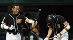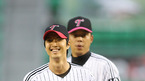 2007 삼성PAVV 프로야구 LG 트윈스와 롯데 자이언츠의 경기가 30일 잠실 야구장에서 벌어졌다.롯데의 2회초 1사 상황에서 정보명이 타격시 방망이를 놓치면서 뒷편에서 타석 대기를 하고 있던 정수근을 향해 날아들자 정수근이 황급히 피한뒤 방망이에 쵸크 칠하러 들어온 정보명의 헬멧에 살짝 방망이를 갖다대며 긴장을 풀어주고 있다./잠실=김영민...
