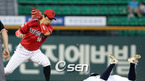 2007 삼성PAVV 프로야구 두산 베어스와 KIA 타이거즈 경기가 4일 잠실 야구장에서 벌어졌다.두산의 2회말 1사 1루 최준석 타석시 KIA 김상훈 포수가 1루 주자 고영민의 2루 도루를 저지하기 위해 2루에 송구 하며 아웃 처리 시키고 있다./잠실=김영민 기자ajyoung@osen.co.kr <2007 삼성 PAVV 프로야구>...