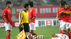 2008 베이징올림픽 축구 아시아 최종예선 한국과 시리아의 경기가 12일 서울 상암월드컵구장에서 벌어져 전반에 터진 김승용의 결승골로 1-0으로 승리를 거두었다. 후반 기성용과 가벼운 충돌을 일으킨 시리아 하발이 마치 얻어 맞은 것처럼 운동장에 쓰러져 있다./상암=손용호 기자spjj@osen.co.kr [Copyright ⓒ 한국 최고의 스포츠...