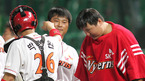 2007 삼성PAVV 프로야구 롯데 자이언츠와 SK 와이번스의 경기가 12일 문학 경기장에서 벌어졌다. 4-1로 승리한 SK 포수 박경완이 7⅔이닝 무실점으로 승리투수가 된 채병룡(오른쪽)에게 축하 인사를 건네고 있다. /인천=황세준 기자 storkjoon@osen.co.kr <2007 삼성 PAVV 프로야구> [Copyright ⓒ 한국...