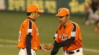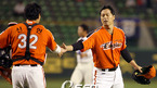 2007 프로야구 삼성 라이온즈와 한화 이글스의 경기가 대구 시민구장에서 벌어져 양팀 선발이 일찍 무너진 가운데 효과적인 계투를 한 한화가 7-4로 역전승, 승차없는 4위가 됐다. 1⅔이닝을 무실점으로 막고 세이브를 거둔 구대성이 신경현 포수와 악수를 나누고 있다./대구=손용호 기자spjj@osen.co.kr <2007 삼성 PAVV 프로야구>...