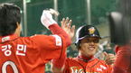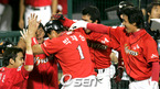2007 삼성PAVV 프로야구 LG 트윈스와 SK 와이번스 경기가 28일 잠실 야구장에서 벌어졌다. SK의 5회초 무사 2,3루 조동화의 2타점 역전 적시타때 2루주자 박재상이 홈인 하면서 동료들로 부터 축하를 받고 있다. /잠실=황세준 기자 storkjoon@osen.co.kr <2007 삼성 PAVV 프로야구> [Copyright ⓒ 한국...