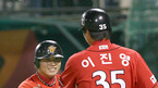 2007 프로야구 SK가 매직넘버 1을 남겨 놓은 가운데 LG 트윈스와 SK 와이번스의 경기가 28일 잠실야구장에서 벌어졌다. 4회말 무사 박용택이 우월 솔로 홈런을 치고 최동수의 환영을 받고 있다./잠실=손용호 기자spjj@osen.co.kr <2007 삼성 PAVV 프로야구> [Copyright ⓒ 한국 최고의 스포츠 엔터테인먼트 전문 미디어...