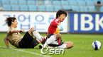 삼성 하우젠K-리그 울산 현대와 수원 삼성의 경기가 29일 울산 문수월드컵구장에서 벌어져 울산 이상호의 연속골로 울산이 2-0으로 수원에 승리를 거두었다. 후반 수원의 페널티 에리어에서 울산 이상호가 돌파를 하다 수원 손승준과 부딪치며 넘어지고 있다./울산=손용호 기자 spjj@osen.co.kr [Copyright ⓒ 한국 최고의 스포츠...