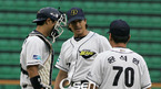 2007 삼성PAVV 프로야구 두산 베어스와 현대 유니콘스의 경기가 3일 잠실 야구장에서 벌어졌다. 두산의 리오스는 9회 1사까지 퍼펙트를 기록했으나 현대 강귀태에 안타를 맞은 뒤 윤석환 투수코치가 나와 강판시키고 있다. 두산이 3-2로 승리, 리오스는 22승을 달성했다. /잠실=황세준 기자 storkjoon@osen <2007 삼성 PAVV...