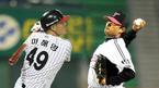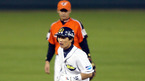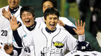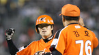 2007 프로야구 플레이오프 2차전 두산 베어스와 한화 이글스 경기가 15일 저녁 잠실구장에서 벌어졌다.한화의 2회초 2사 1,2루 연경흠 1타점 역전 적시타를 날리고 1루 김호 코치로 부터 환영을 받고 있다./잠실=김영민 기자ajyoung@osen.co.kr <2007 삼성 PAVV 프로야구> [Copyright ⓒ 한국 최고의 스포츠...