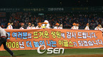 2007 프로야구 플레이오프 3차전 두산 베어스와 한화 이글스 경기가 17일 저녁 대전구장에서 벌어졌다.두산 베어스가 6-0 완승을 거두고 한국시리즈에 진출했다. 경기 후 두산 선수단이 플래카드를 들고 환호하고 있다./대전=김영민 기자ajyoung@osen.co.kr <2007 삼성 PAVV 프로야구> [Copyright ⓒ 한국 최고의 스포츠...