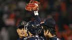 2007 프로야구 플레이오프 3차전 두산 베어스와 한화 이글스 경기가 17일 저녁 대전구장에서 벌어져 두산이 6-0으로 완승, 3연승으로 한국시리즈에 진출했다. 플레이오프 MVP에 선정된 두산 이종욱이 시상대에 올라 서 있다./대전=김영민 기자ajyoung@osen.co.kr <2007 삼성 PAVV 프로야구> [Copyright ⓒ 한국...