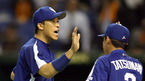 요미우리 자이언츠와 주니치 드래건스의 센트럴리그 클라이맥스시리즈 2스테이지 1차전 경기가 18일 도쿄돔에서 벌어져 주니치가 우즈의 투런홈런을 앞세워 5-2로 승리했다. 이승엽은 2안타를 치며 분전했지만 팀의 패배로 빛이 바랬다. 이병규는 1볼넷에 무안타로 부진했다. 이병규가 경기 후 타자 최고참 다쓰나미(38)와 하이파이브를 하고 있다./도쿄돔=손용호...