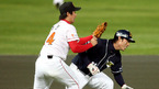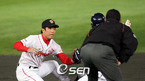 2007 프로야구 한국시리즈 1차전 SK 와이번스와 두산 베어스 경기가 22일 저녁 인천 문학야구장에서 벌어졌다. 5회초 무사 1루서 2루 도루에 성공한 이종욱이 SK 포수 박경완의 송구가 뒤로 빠지자 3루로 뛰려다 SK 유격수 정근우의 발에 걸려 넘어진 뒤 오석환 2루심에게 주루방해가 아니냐고 항의하고 있다./인천=손용호...