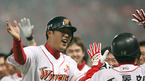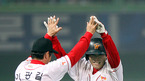 2007 프로야구 한국시리즈 2차전 SK 와이번스와 두산 베어스 경기가 23일 저녁 인천 문학야구장에서 벌어졌다.SK의 5회말 2사 조동화 우월 솔로 홈런을 날리고 홈인 1회말 투런 홈런을 날린 이호준으로 부터 축하를 받고 있다./인천=김영민 기자ajyoung@osen.co.kr <2007 삼성 PAVV 프로야구> [Copyright ⓒ 한국...