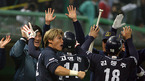 2007 프로야구 한국시리즈 2차전 SK 와이번스와 두산 베어스 경기가 23일 저녁 인천 문학야구장에서 벌어졌다.두산의 6회초 2사 2,3루 이대수의 중전 안타때 고영민 김동주가 역전 득점을 올리며 동료로 부터 축하를 받고 있다./인천=김영민 기자ajyoung@osen.co.kr <2007 삼성 PAVV 프로야구> [Copyright ⓒ 한국...