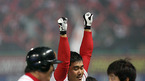 2007 프로야구 한국시리즈 2차전 SK 와이번스와 두산 베어스 경기가 23일 저녁 인천 문학야구장에서 벌어졌다.SK의 1회초 2사 1루 이호준이 우월투런 홈런을 날리고 홈인 득점을 올리며 환호 하고 있다./인천=김영민 기자ajyoung@osen.co.kr <2007 삼성 PAVV 프로야구> [Copyright ⓒ 한국 최고의 스포츠 엔터테인먼트...