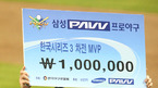 2007 프로야구 한국시리즈 3차전 SK 와이번스와 두산 베어스 경기가 비가 오는 가운데 25일 잠실야구장에서 벌어져 SK가 6회초 상대 내야진의 연이은 에러 등으로 대거 7점을 뽑아 9-1로 완승, 첫 승을 기록했다. 6이닝 1실점 호투로 3차전 MVP가 된 SK 로마노가 상금 보드를 들어보이고 있다./잠실=손용호 기자 spjj@osen.co.kr...