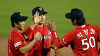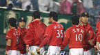 2007 프로야구 한국시리즈 3차전 SK 와이번스와 두산 베어스 경기가 비가 오는 가운데 25일 잠실야구장에서 벌어져 SK가 6회초 상대 내야진의 연이은 에러 등으로 대거 7점을 뽑아 9-1로 완승, 첫 승을 기록했다. 경기 후 김성근 감독이 선수들과 하이파이브를 하고 있다./잠실=김영민 기자ajyoung@osen.co.kr <2007 삼성...