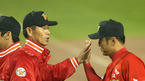 2007 프로야구 한국시리즈 3차전 SK 와이번스와 두산 베어스 경기가 비가 오는 가운데 25일 잠실야구장에서 벌어져 SK가 6회초 상대 내야진의 연이은 에러 등으로 대거 7점을 뽑아 9-1로 완승, 첫 승을 기록했다. 김성근 감독이 박경완 포수와 하이파이브를 하고 있다./잠실=손용호 기자spjj@osen.co.kr <2007 삼성 PAVV...