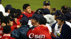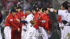 2007 프로야구 한국시리즈 3차전 SK 와이번스와 두산 베어스 경기가 25일 잠실야구장에서 벌어졌다. SK의 6회초 1사 2,3루 김재현 타석서 패스트볼이 되자 3루 주자 정근우가 홈인한 뒤 동료들의 환영을 받고 있다./잠실=김영민 기자ajyoung@osen.co.kr <2007 삼성 PAVV 프로야구> [Copyright ⓒ 한국 최고의...